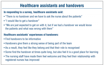 Continuity of care in the acute hospital setting depends on the existence of effective and efficient mechanisms of communication between all healthcare teams.6 The handover of information regarding patient care from the nurse or midwife to the healthcare assistant is a vital part of integration into the team.5 However, healthcare assistants are not included in the patient handover at the beginning and end of each day.