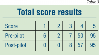 Questions three and 10 looked at confidence levels in providing and documenting information in an organised, succinct manner. Overall, there was a slight increase in these areas in the post pilot questionnaire, although the number of fives scored in 10a fell from five to three post-pilot with a corresponding increase in fours scored.
