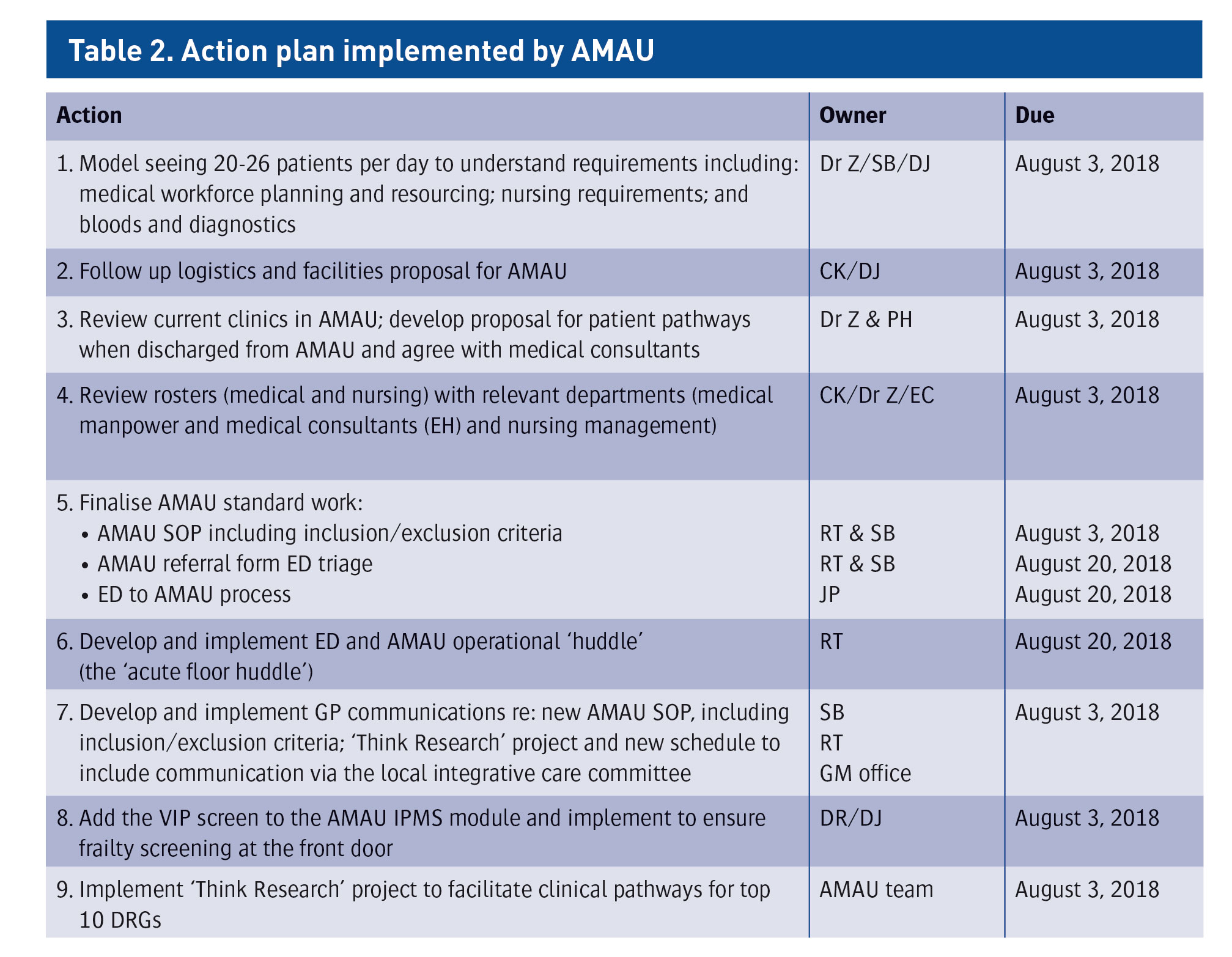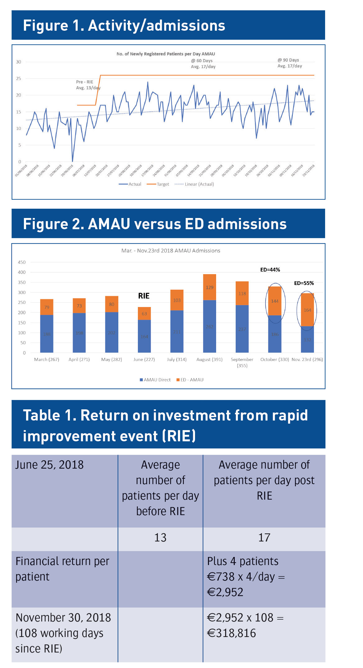 In supporting the Ireland East Hospital Group (IEHG) unscheduled care programme, a key priority is the need to increase the flow of patients through and have a fully operational AMAU. In June 2018 the AMAU was open Monday to Friday 8am-9pm, with last patient admission by approximately 3pm. There were approximately 13 patients per day flowing through AMAU and the potential demand was found to be greater than available capacity.