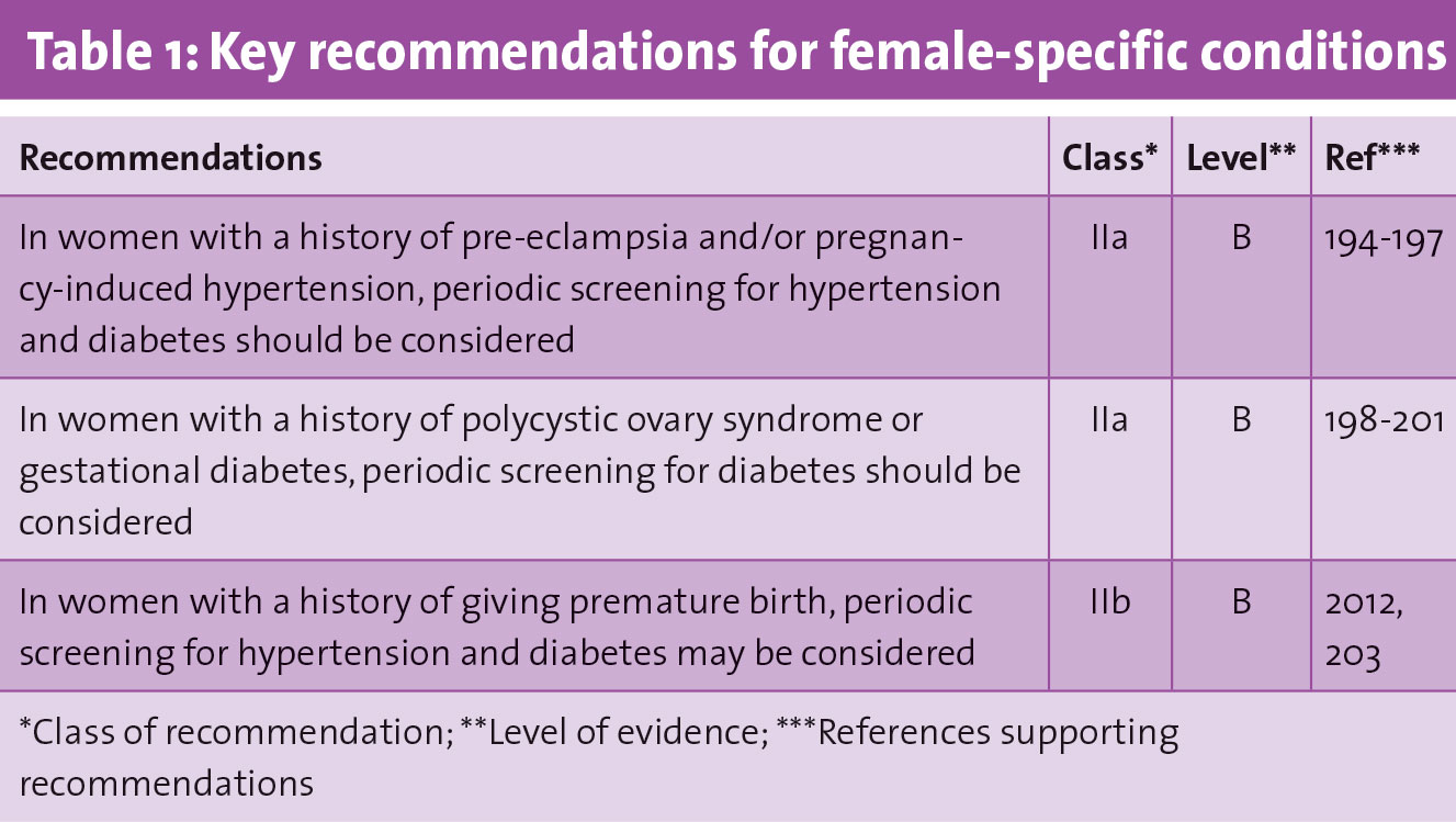 Premature menopause has been associated with an increased risk of CVD; however there is insufficient evidence on a possible increased risk of hypertension or diabetes mellitus.1 Table 1 provides an overview of key recommendations for practice as outlined in the guidelines.
