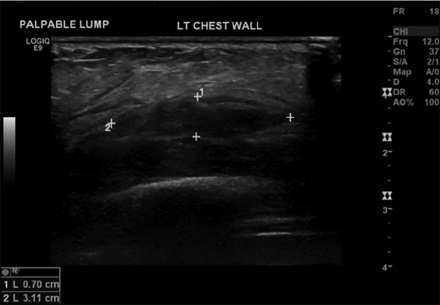 Figure 1: Ultrasound of anterior chest wall – hypoechoic complex fluid collection in the left chest wall(click to enlarge)