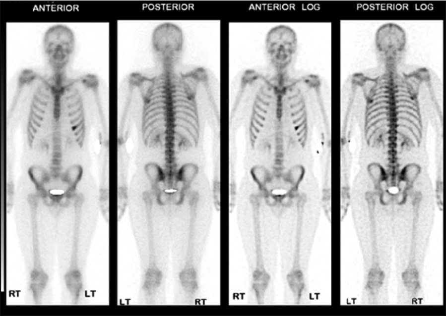 Figure 4: Nuclear imaging of whole body scan – radioisotope uptake of the sixth rip on anterior view(click to enlarge)