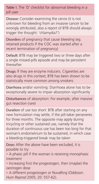 It is crucial that prescribers have a thorough, systematic but workable method of managing this complaint. In the seventh edition of Prof John Guillebaud’s* handbook, Contraception Today, which was published earlier this year, there is a checklist section on why abnormal bleeding occurs in women who take the contraception pill.