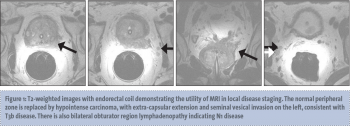 MR spectroscopic imaging (MRSI) generates information about the relative concentrations of specific metabolites within tissues and is commonly performed in 3D imaging of the brain.22 When used for prostate imaging, an endorectal coil is recommended for 3 tesla (3T) magnets and required for 1.5T magnets.23 T2-weighted images are generated (see Figure 1) and are overlaid then by spectral tracings generated by MRSI. MRSI analyses a defined area for specific molecules such as hydrogen ions or protons.