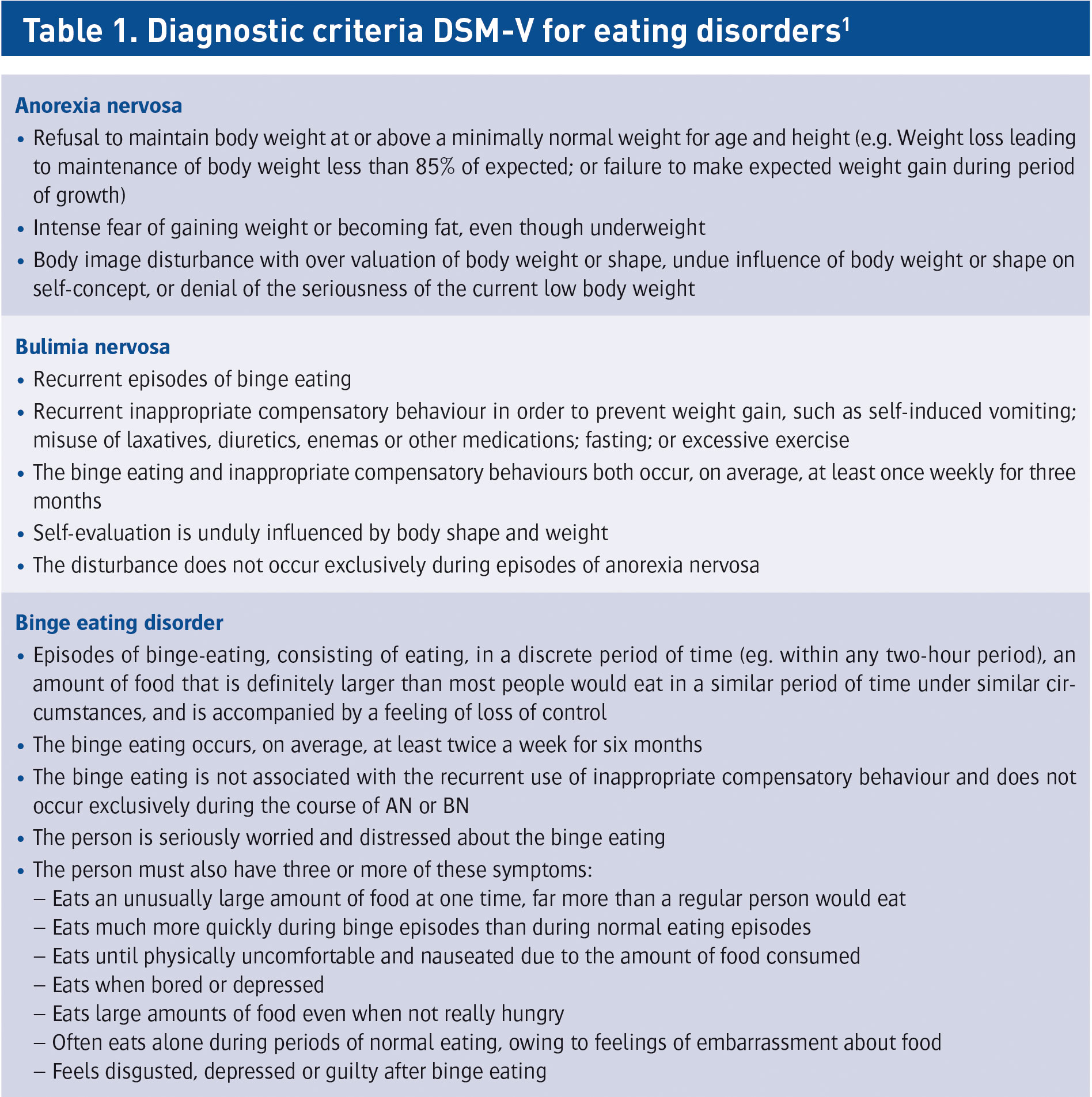 In binge eating disorder, which is a new category introduced in the DSM-V, the hallmark is recurrent and frequent episodes of overeating, reinforced by feelings of loss of control and rapid, often secretive eating. In addition there are feelings of intense guilt, shame and depression.1