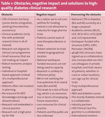 The way to overcoming the obstacles to high-quality research in diabetes is by setting up a national clinical trial network. The Health Research Board is currently in the process of evaluating nine clinical network proposals, of which it will choose four to fund at a total of 2.5 million each over five years.