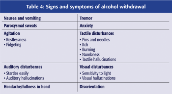 All withdrawals need general support and a proportion will need pharmacotherapy to modify the withdrawal-induced neuroexcitability. Signs and symptoms of alcohol withdrawal should be assessed (Table 4) and assigned a score depending on whether they are mild to severe. The scores are added up to give an Alcohol Withdrawal Score (AWS). The most widely used tool example is the Clinical Institute Withdrawal Assessment of Alcohol Scale, Revised (CIWA-Ar)8 which grades withdrawal from mild to severe.