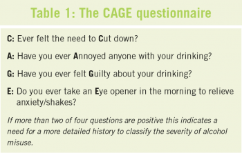 The CAGE questionnaire is a well known four question screening tool for alcohol misuse (see Table 1). The 10-item AUDIT questionnaire can also be used to screen for alcohol misuse and determine where on the scale from low risk to dependence a patient lies (see Table 2).