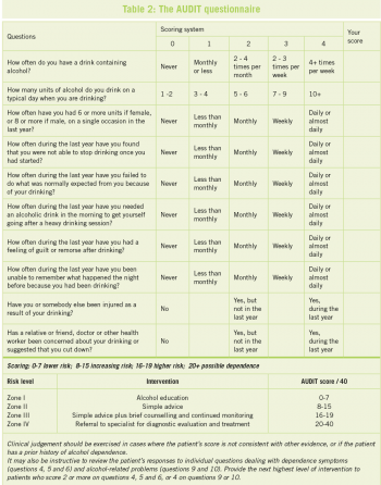 The AUDIT questionnaire is useful in determining where on the scale from low risk to dependence a patient lies and the intervention needed.6
