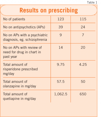 Dr Feargal Leonard, consultant psychiatrist, who also cares for patients in St Mary’s Hospital, was consulted before and after the first cycle for input from his team. After the first cycle there was a practice meeting to discuss the results, and a policy on antipsychotic prescribing in the nursing home was agreed upon. This included guidelines about starting and discontinuing antipsychotic medication and was based on the NICE guidelines and the best practice guide from the Alzheimer’s Society UK and RCGP.3