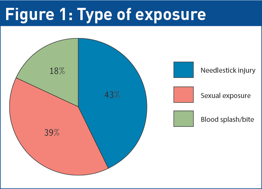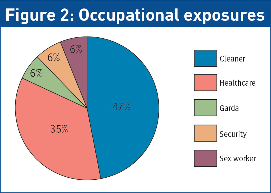 Fifty-four patients were commenced on five-day PEP starter packs between January 1 and July 1 2014. Of these, 70% were male, representing two-thirds of the cohort (n = 38). The mean age was 32 years, with the range being from 20 to 61 years. In total, 24 patients had obtained NSI; 21 presented post-sexual exposure and nine were commenced on PEP post-mucous membrane exposure, either from human bite or blood splash injuries. It is important to emphasise that almost all human bites do not require any follow up for HIV or hepatitis C.3 Included in our audit were extreme cases which are the exception to the rule. It was noted that 17 patients had been exposed to BBVs during occupational incidents: eight cleaners, six healthcare workers, one security guard, one member of An Garda Siochana and one sex worker.