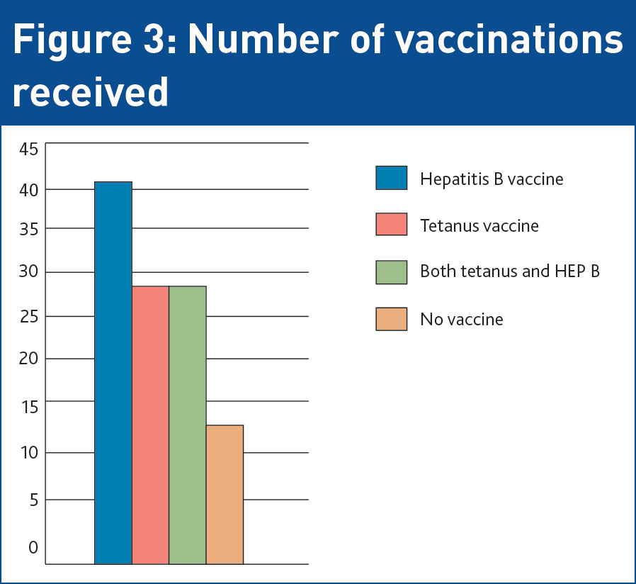 A total of 31 patients received tetanus immunisation. Of the 23 patients who did not, four had been vaccinated previously, however, there was no documentation in each case of whether this had been in the previous 10 years.4 Of the 19 patients who did not receive tetanus vaccine, and where there was no documentation regarding prior immunisation, six had presented with NSIs and one with a human bite. All four other patients who had sustained human bites received tetanus vaccines. In total, 16 patients presenting with needlestick injuries received tetanus (67% of NSIs).