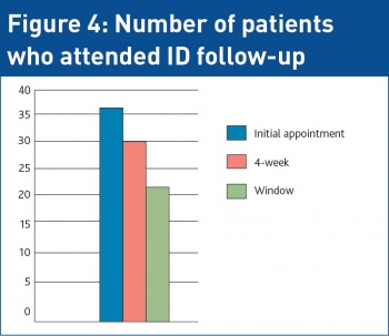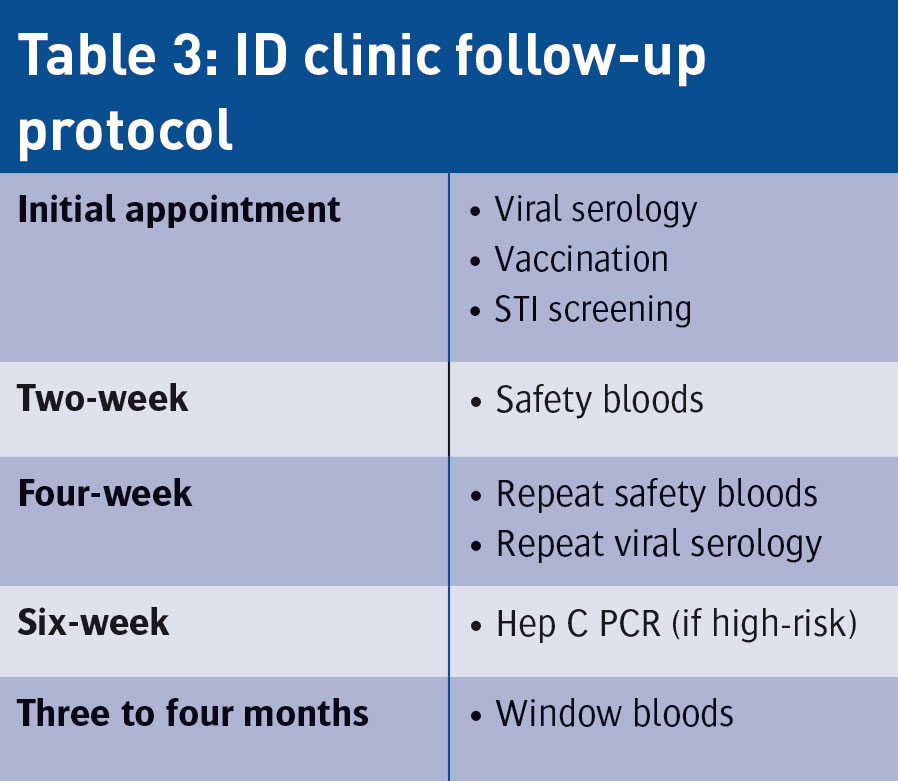 Overall, four patients did not attend appointments for convenience reasons. A possible avenue to address this could be to liaise with patients’ GPs from the outset. After an initial ID clinic review, where risk estimation, counselling regarding possible positive results and a decision whether or not to continue PEP is made, care could be transferred back to the community for safety and window bloods. It is recognised that patients often would prefer if their GP was not aware that they had been treated with PEP, particularly in the case of sexual exposure. A possible route to overcome this could be to create a discharge document, with the indication for PEP not disclosed, indicating that the patient requires safety and window bloods. This would have the added benefit of reducing both ID clinic numbers and waiting lists, while returning the gate-keeper role to the GP and allowing continuity of care.
