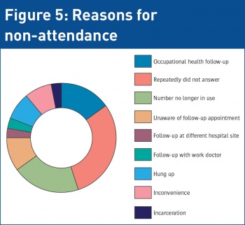 Overall, 14 patients did not attend any follow-up appointments. A further 14 attended at least once but did not complete their follow-up. These patients were contacted by telephone to establish the reason for non-attendance and to determine ways in which attendance rates could be improved. Of these 14 patients, four were healthcare workers who arranged follow-up with occupational health. Three patients said they were not informed about a follow-up appointment and one who was advised to have repeat viral serology with their general practitioner in six months time. An ID referral form was completed for this patient on electronic patient records. There was one patient whose care was transferred to and completed at a different, more convenient hospital site, one patient attended with their work doctor and nine repeatedly did not answer; five telephone numbers were no longer in use, two patients hung up when the reason for contact was disclosed, two patients discussed how they had been too busy to attend and found it difficult to arrange travel to the clinic, and one patient had since been incarcerated. Follow-up and window bloods have since been arranged for two of these patients who agreed to attend.