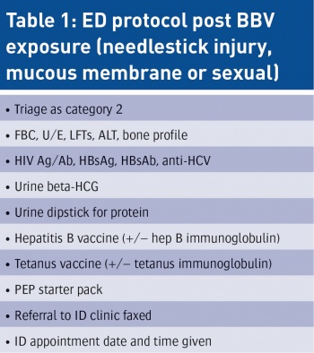 • Patients who present with a needlestick injury (NSI), mucous membrane exposure or sexual exposure to possible blood-borne viruses (BBV) are managed as per protocol in the emergency department (ED). This protocol has been developed as per the HSE EMI Toolkit ‘Guidelines for the emergency management of injuries’.1 Patients should be triaged as category 2 in the ED to ensure that they are seen urgently and commenced on post-exposure prophylaxis (PEP) as soon as possible after exposure (must be within 72 hours).