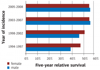 Similar improvements in survival were seen for females; from 47% for those diagnosed in 1994-1997 to 55% for those diagnosed in 2005-2008.