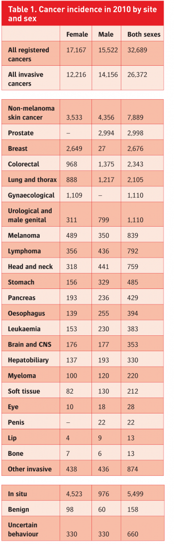 In 2010, 32,694 new cancers were diagnosed in Ireland (see Table 1). Most of these (26,372; 80%) were invasive and almost all the rest were in situ cancers of skin, breast and cervix. By far the most common invasive cancer was non-melanoma cancer of the skin. There were more than 2,000 new cases each year of four other cancers – prostate, breast, lung and colorectal. These four sites accounted for 40% of all invasive cancers, excluding non-melanoma skin cancer.
