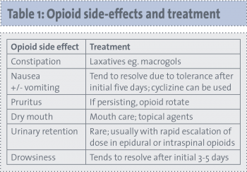 Opioids commonly cause side effects and children often do not voluntarily report them. It is important to ask specifically about any possible side-effects so they can be managed and their burden reduced (see Table 1). In some cases, rotation to another opioid to overcome intolerable side effects may be warranted.