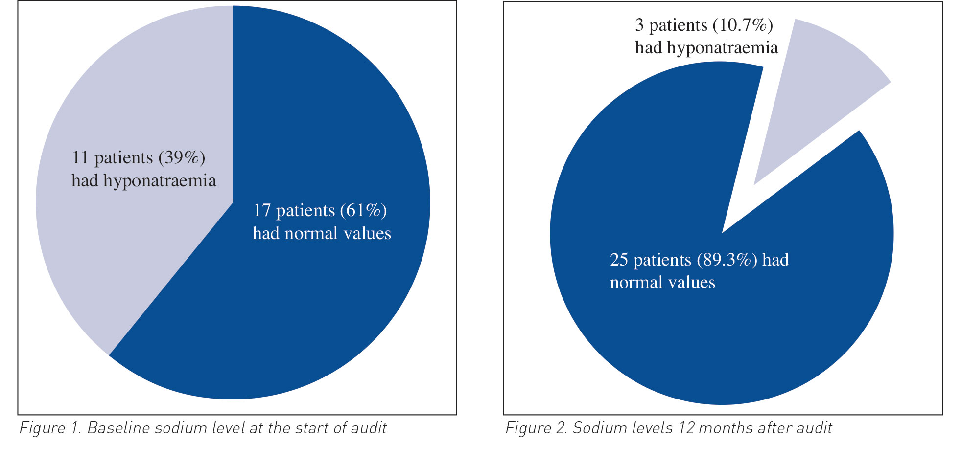 Serum sodium level in the 12 months preceding the time of audit and the most recent serum sodium levels were checked for the 28 residents; the mean serum sodium levels were 137.7mmol/L (preceding audit) and 135.1mmol/L (most recent level). Hyponatraemia was taken as a serum sodium level of <135mmol/L and all blood tests were carried out in the biochemistry laboratory at the hospital.