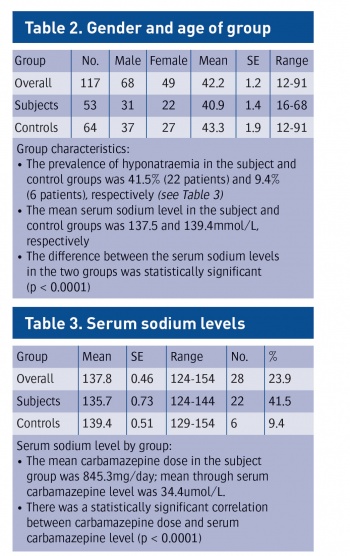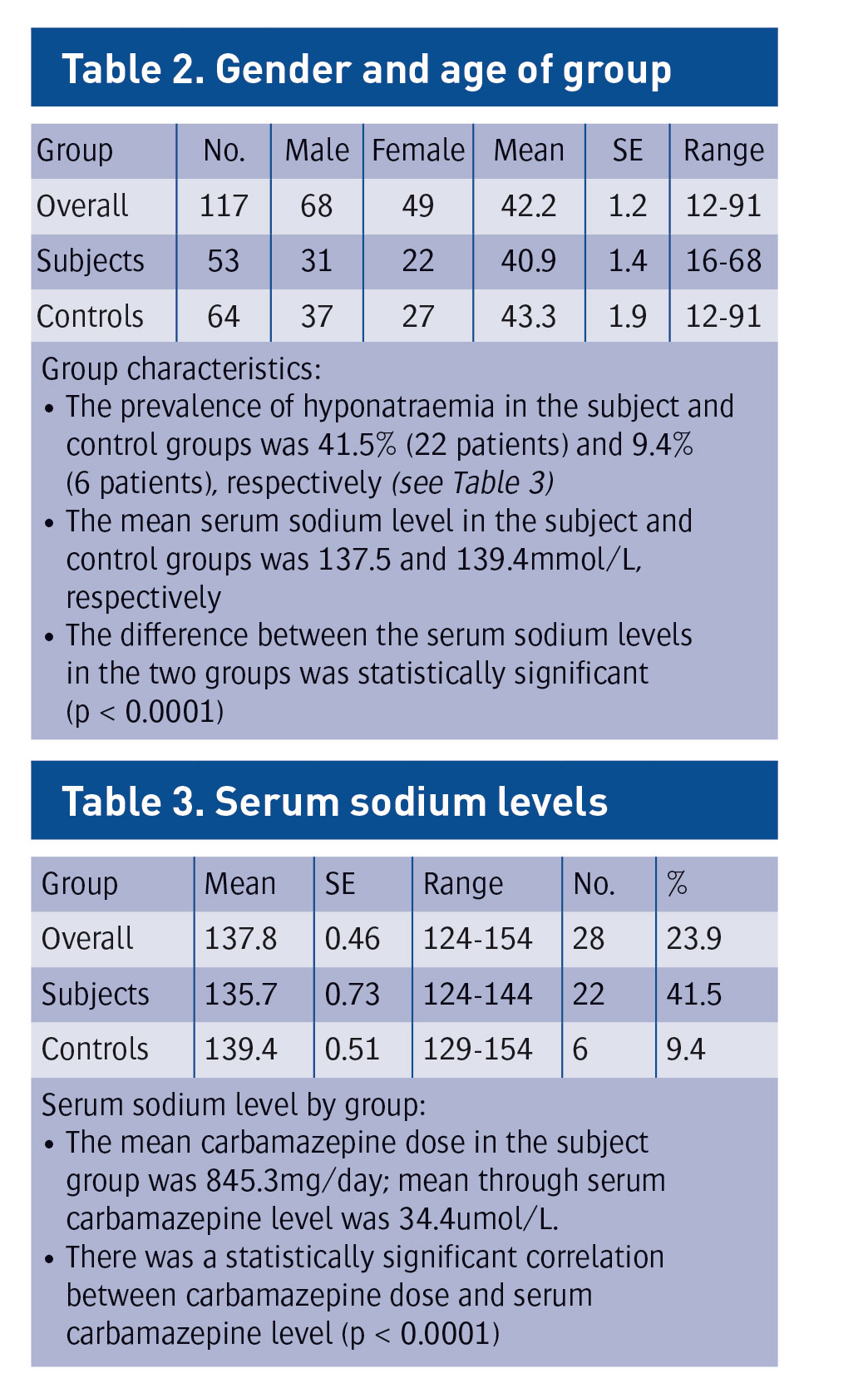 Serum sodium levels were compared between the subject and control groups; the relationships between serum sodium level, sex, age, daily carbamazepine dose and serum carbamazepine level were also examined. There was no significant difference between the subject and control groups in terms of age or sex (see Table 2) and males outnumbered females in both groups. The mean age of the participants in the study was 42.18 years (range = 12-91 years).