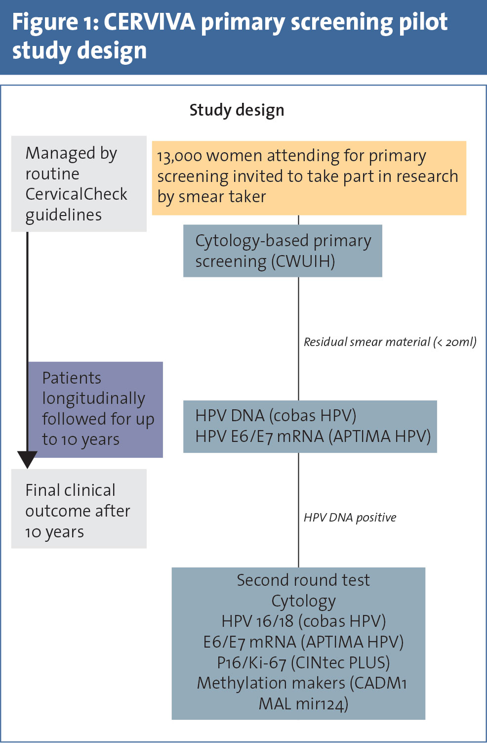 CERVIVA, in partnership with CervicalCheck, are currently undertaking a HPV primary screening study which is evaluating and comparing different strategies for the triage of women with a HPV-positive primary screening test. This study, funded by the Health Research Board, is an observational cohort study and is aiming to recruit 13,000 women attending primary care for their routine CervicalCheck smear test (see Figure 1). Women attending for their routine CervicalCheck smear tests are invited to participate in the study and asked to give written informed consent.