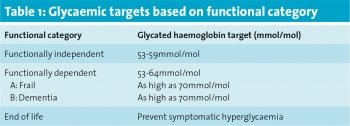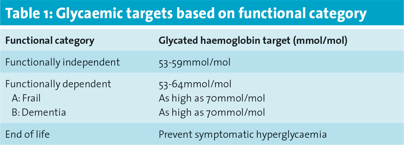 The emphasis of management of diabetes in older people is on achieving glycaemic levels that prevent and reduce vascular complications as well as reducing the risk of hypoglycaemia. Glycaemic targets should be individualised based on comorbidities, functional status, history of risk of hypoglycaemia, presence of micro/macrovascular complications and cognitive impairment. Table 1 shows the glycaemic targets based on functional category.
