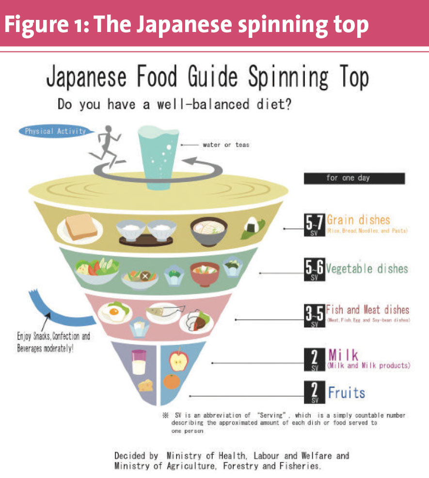 One such example is Japan, which has inverted its food pyramid and turned it into a spinning top, putting the most important food groups to the top.4 The spinning top – koma in Japanese – was and still is a popular toy in the country and so it was felt that the population would be able to identify with it more easily.4