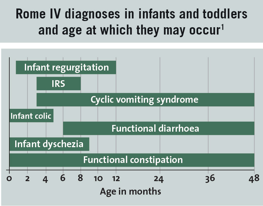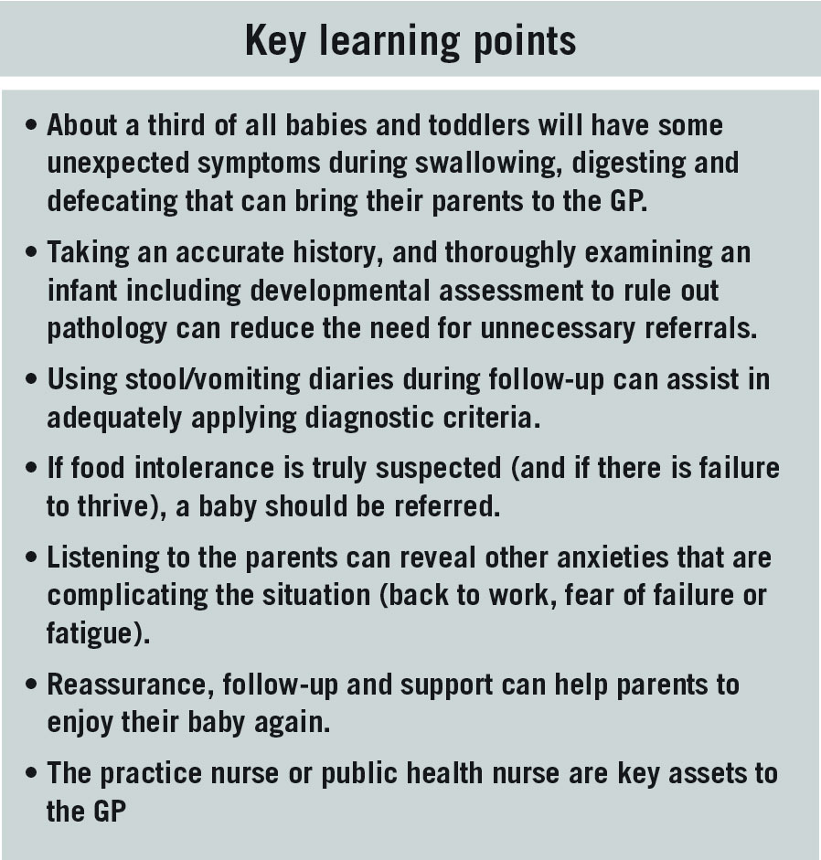Neonates, babies and toddlers can present to the GP with a wide variety of functional, non-pathological disorders of feeding and gastrointestinal function. Reported prevalence of functional gastrointestinal disorders (FGID) in infants and toddlers ranges between 27% and 38%.1 Therefore, it is likely that at least one-in-three new parents will bring symptoms of poor feeding, vomiting, constipation, loose stools or crying associated with feeding to the attention of the GP.