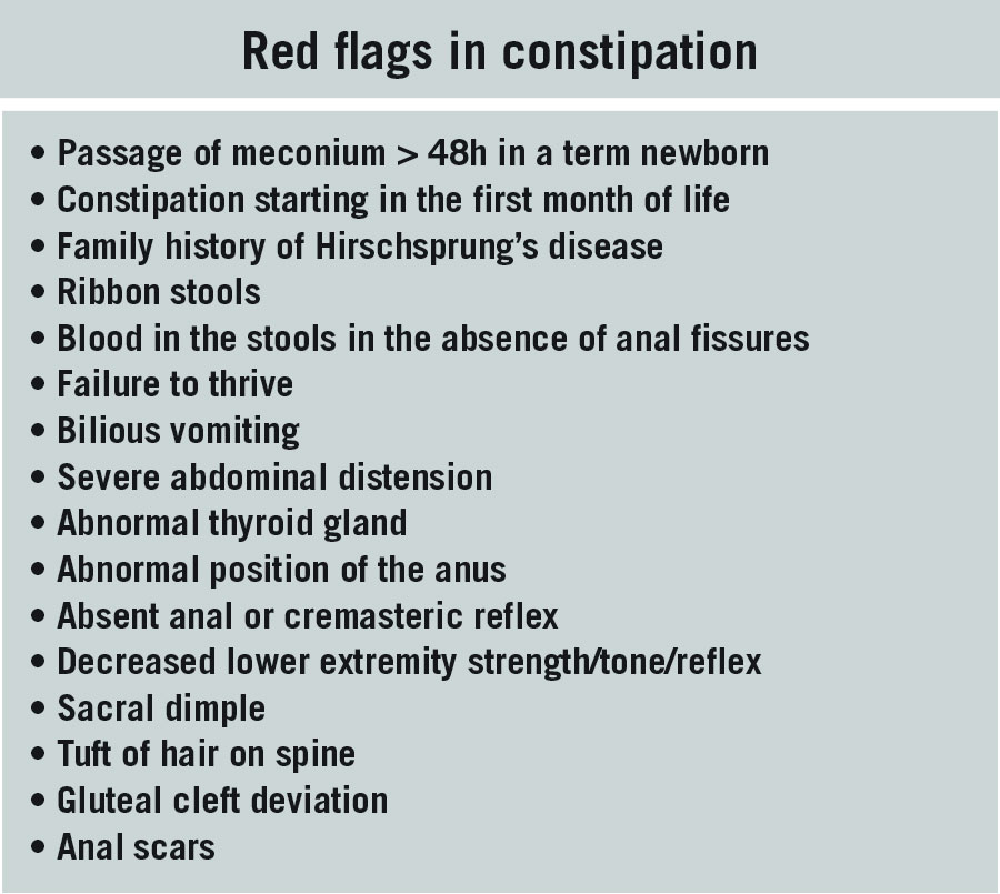The key is an accurate record of the frequency or infrequency of stool from the parents, and this may include other caregivers in the older toddler or school-age child. NICE guidelines on managing constipation in children recommend that if faecal impaction is suspected, disimpaction may be necessary and to be followed up with laxatives.8 Prompt initiation of a recommended disimpaction regimen can help to reduce the long-term sequelae and regular follow-up can help to keep parents reassured and well educated in managing a high-fibre, hydrating diet and to use laxatives appropriately.