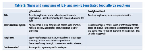 Finally, food intolerance is a non-immunological reaction that can be caused by enzyme deficiencies, pharmacological agents and naturally occurring substances. They are usually idiosyncratic reactions and are often not reproducible. In-depth consideration of food intolerances is beyond the scope of this article other than to say that dietitian input is always valuable.Non-IgE-mediated – also referred to as delayed or cell-mediated hypersensitivity – occurs hours or days after exposure. Most non-IgE-mediated food allergy is non-specific and is usually considered among a large list of alternative diagnoses, especially in young children. There are however, constellations of symptoms and an index of suspicion must be maintained. Whereas common conditions such as infant colic or gastro-oesophageal reflux may be caused by food allergy, in general they are not.