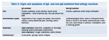 The first indication that an individual has a food allergy is usually when they display signs consistent with an allergic reaction after contact with a particular food or substance (the allergen). The use of an allergy-focused history and examination will help distinguish the type of food hypersensitivity (ie. allergy or intolerance) and if it is thought to be an allergy, whether it is IgE- or non-IgE-mediated. Many signs and symptoms of food allergy reactions, both IgE- and non-IgE-mediated, are included in Table 2.