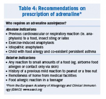 Although avoidance is the cornerstone of treatment, many children will have accidental exposures to the food to which they are allergic to, and some will react to new foods. Whether medication is required after exposure is dependent on the severity of the reaction that occurs. The most commonly used medication to treat allergic reactions is antihistamine. A non-sedating antihistamine should be easily accessible to all children with known food allergy for the management of mild to moderate reactions. The management of severe allergic or anaphylactic reactions requires intramuscular adrenaline as the first-line treatment. Other medications such as oxygen, bronchodilators and antihistamines may also be required once the adrenaline is administered (or while waiting for it). There are international guidelines as to who requires an adrenaline autoinjector (see Table 4). Although included among the relative indications, it is our practice to recommend adrenaline to all children with a confirmed nut allergy.