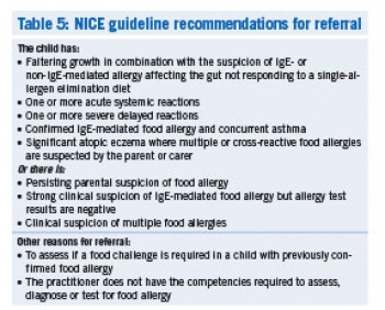 Many children with food allergy will need assessment by a paediatrician or a paediatric allergist. There is good evidence now that seeing a paediatrician with experience in managing allergic disease improves patient outcomes and reduces the risk of more severe reactions. The recommendations for referral made in the recent NICE guideline on diagnosis and assessment of food allergy in children and young people in primary care and community settings are included in Table 5. Outside of the scope of this guideline are children with previously confirmed IgE-mediated allergy, who will need referral to assess if a food challenge is required so as to cease unnecessary elimination diets. All of the recommendations in the NICE guideline are dependent on the healthcare professional having the appropriate competencies to diagnose and assess. If a practitioner does not consider themselves competent in this regard then referral is also indicated.