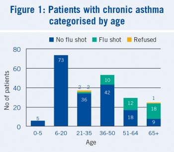 The HSE and the Health Protection Surveillance Centre (HPSC) strongly recommend the vaccine is administered to those with chronic respiratory disease, including those with moderate to severe chronic asthma.4,5 The UK Department of Health further classifies people with asthma who need the flu vaccine as those “requiring continuous and repeated use of inhaled or systemic steroids or with previous exacerbations requiring hospital admission”.6 Questions arise as to whether this clinical risk group is being vaccinated adequately in the GP setting.