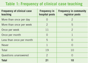 The questionnaire contained four sections. Section A contained demographic questions, Section B examined exposure to clinical case teaching in hospital including frequency, duration of each session and total duration of teaching per week. Section C was similar to section B, focusing on clinical case teaching in community settings.  Section D questions examined what worked well and what could be improved with regard to clinical case teaching. Section D also included questions on what effects, if any, implementation of the European Working Time Directive  had on clinical case teaching.