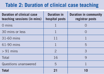 Clinical case teaching in the community was more frequent and of longer duration than that received in hospital settings, with 100% of trainees having formal teaching each week. Despite busy surgeries and brief appointment times, GP trainers were still finding significant time for teaching, and in 89% of cases (eight out of nine trainees), this was for more than one hour per week.