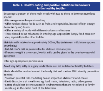 The infancy and toddler years undoubtedly present a potentially ideal window of opportunity for obesity prevention.3 Given that an obese two-year-old is about twice as likely as a non-obese two-year-old to become an obese adult,4 there has never been such a need to convince and educate parents of the importance of complying with toddler healthy eating guidelines. Table 1 outlines some recommendations for practice on nutritional behaviour in healthy young children.