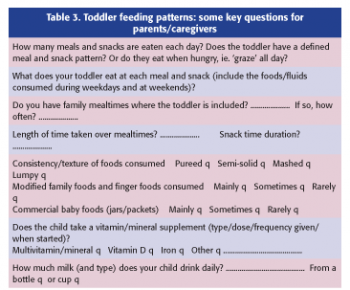 To ascertain the nutrient sufficiency of the toddler’s current diet, and to identify the specific areas to target in advice, it may be worthwhile asking some of the key questions outlined in Table 3.