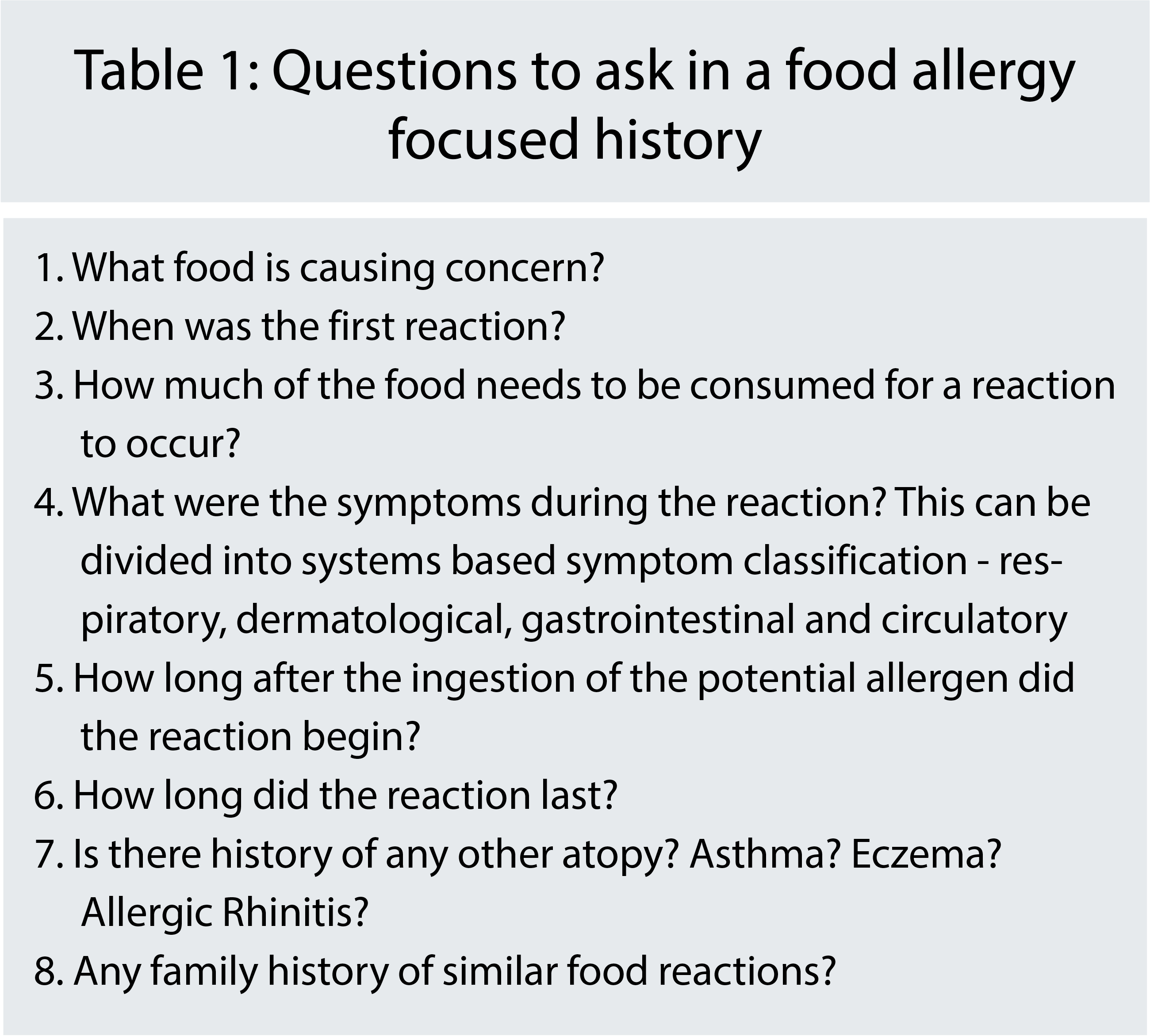 IgE and non-IgE mediated reactions can be differentiated through careful history taking. In addition to the questions in Figure One, it is important to assess how reproducible the reaction is, as food allergy is a consistent and reproducible reaction. If not reproducible, other potential diagnoses, eg. atopic dermatitis, hereditary urticarial syndromes should be considered. The prevalence of food allergies can vary between ethnic groups, and this should be noted when taking a history.