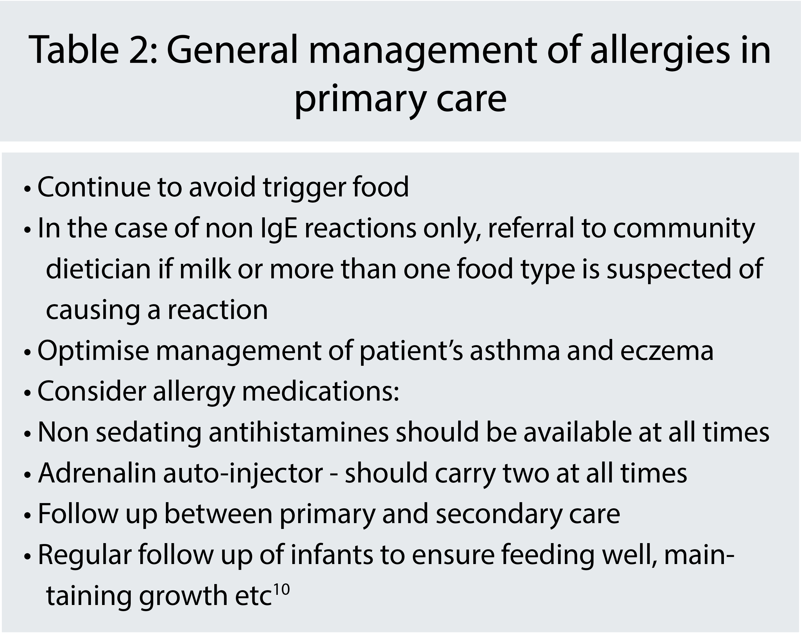 Following history and examination, children with suspected food allergy/anaphylaxis should be referred to secondary care for confirmation and appropriate management.