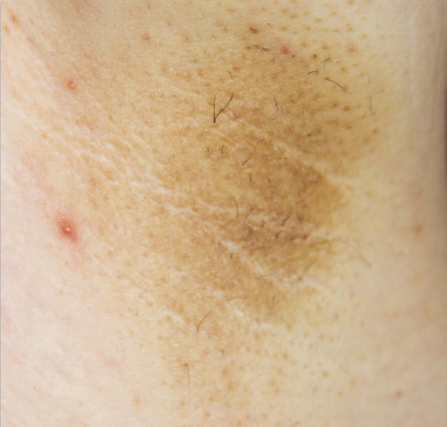Picture 3. Acanthosis nigricans involving the axilla. Note the dark brown, velvety skin thickening(click to enlarge)