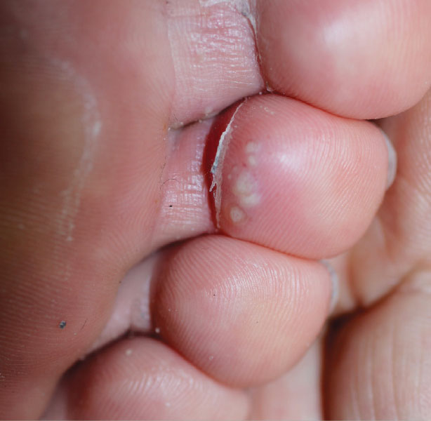 Picture 5. Tinea pedis fungal infection with a very itchy vesicular reaction. Treatment is indicated in this diabetic patient as there is a risk of bacteria penetrating irritated skin to cause foot-threatening deep infection(click to enlarge)
