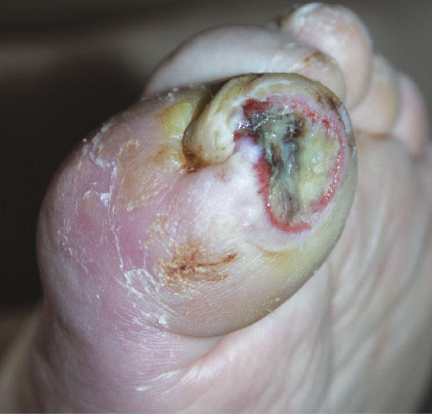 Picture 6. A hammer toe deformity has caused excessive wear and pressure on the plantar surface of the big toe, leading to ulceration, cellulitis and osteomyelitis. This diabetic foot ulcer was on an ischaemic, neuropathic limb, did not respond to treatment and subsequently required amputation(click to enlarge)