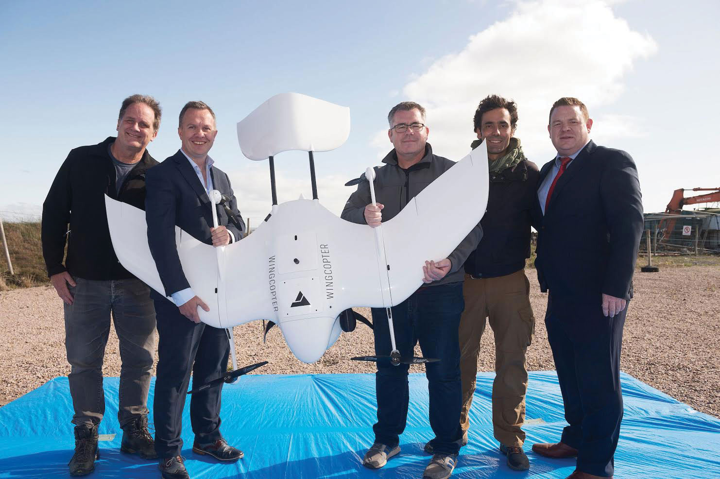 Picture l-r: Steven Flynn, Skytango, Professor Derek O’Keefe, NUI Galway, Wayne Floyd, Survey Drone Ireland, Santiago Montenegro UAV Specialist, Wingcopter and Marc Daly, Vodafone Ireland with the world’s first diabetes drone. The drone completed the first autonomous, beyond visible line of sight drone delivery of insulin, connected by Vodafone IoT, from Connemara Airport to Inis Mór on the Aran Islands. The diabetes drone was given special research permission from the Irish Aviation Authority to show the possibility of future deliveries of this kind within planned drone corridors. Photo: Andrew Downes, Xposure