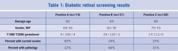 In practice C, patients averaged a little younger, but had about the same mix of more men than women with diabetes, who were mostly type 2. The rate of completed screenings was a disappointingly low 23% (29 of 128 charts). Some 31% had already developed retinal pathology. If the same rate of diabetic retinopathy exists in the unscreened population, at least 30 more patients might have undetected retinopathy in this practice, and the rate of pathology would be expected to increase as the population with diabetes in the practice aged.