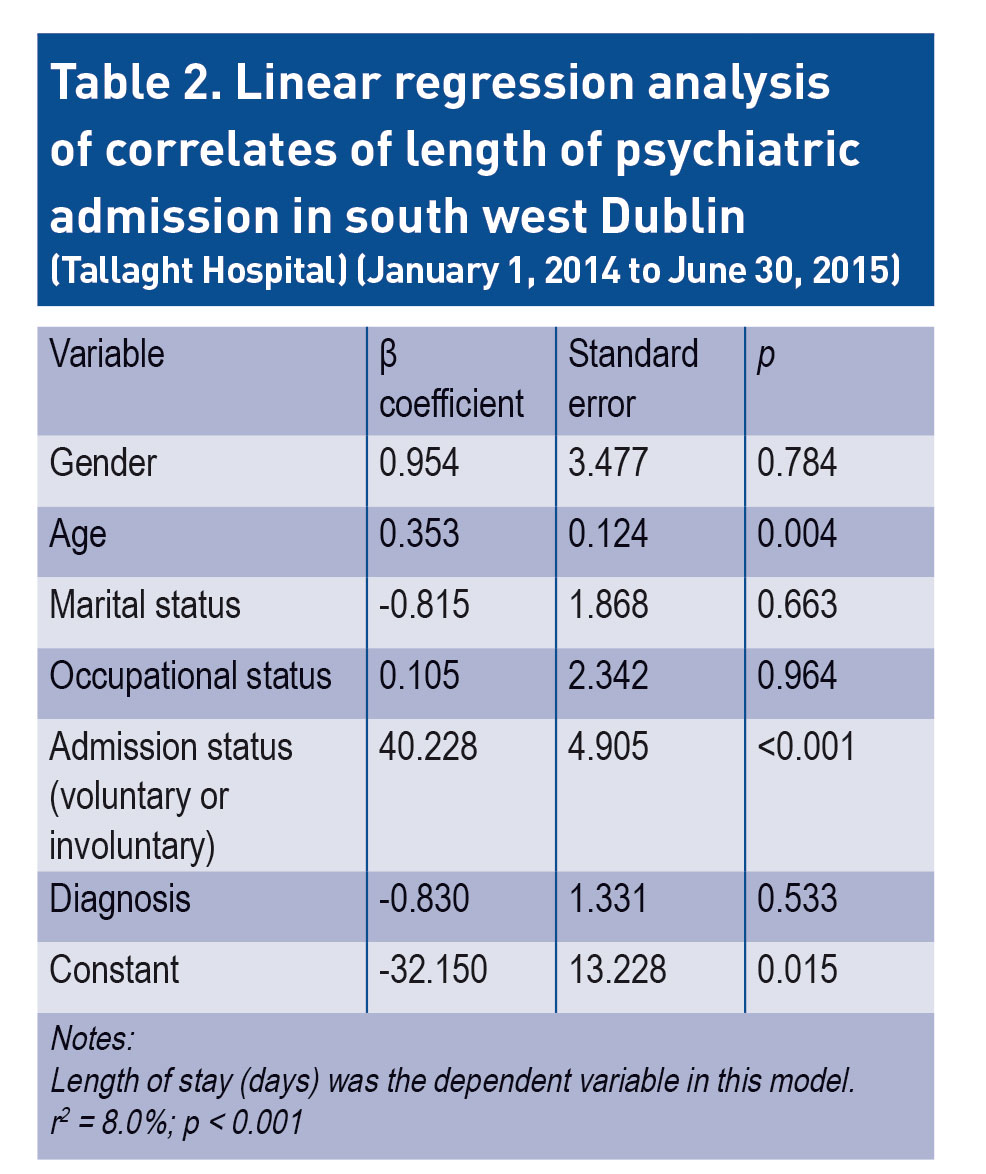 Longer duration of inpatient psychiatric admission in south west Dublin is independently associated with involuntary status and increased age, and is not independently associated with gender, marital status, occupational status or clinical diagnosis. While it is possible that certain diagnoses are associated with involuntary status, it is nonetheless notable that the collinearity diagnostics in this study indicate that no two variables (e.g. diagnosis and admission status) were so closely related to each other as to render their individual effects indistinguishable from each other.