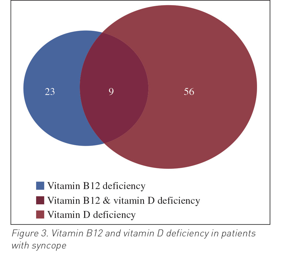 On the other hand 56% (n = 56) of patients with syncope had vitamin D deficiency, 24% (n = 24) of patients with CSS were deficient in vitamin D, 22% (n = 22) had OH and 12% (n = 12) were given the diagnosis of POTS. Nine patients had a deficiency of both vitamin D and vitamin B12. A total of 34 (60%) of the 56 patients with vitamin D deficiency and 13 patients (58%) with vitamin B12 deficiency were female with syncope diagnosed by tilt table testing (see Figure 3).