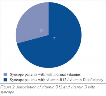 Out of these 100 patients, 71 had vitamin B12 or vitamin D deficiency. Hence, only 29 patients had normal vitamin levels (see Figure 2). A total of 23% (n = 23) patients with syncope were vitamin B12 deficient; out of these 12% (n = 12) were diagnosed as OH and 9% (n = 9) with CSS, while 2% (n = 2) were diagnosed with POTS.