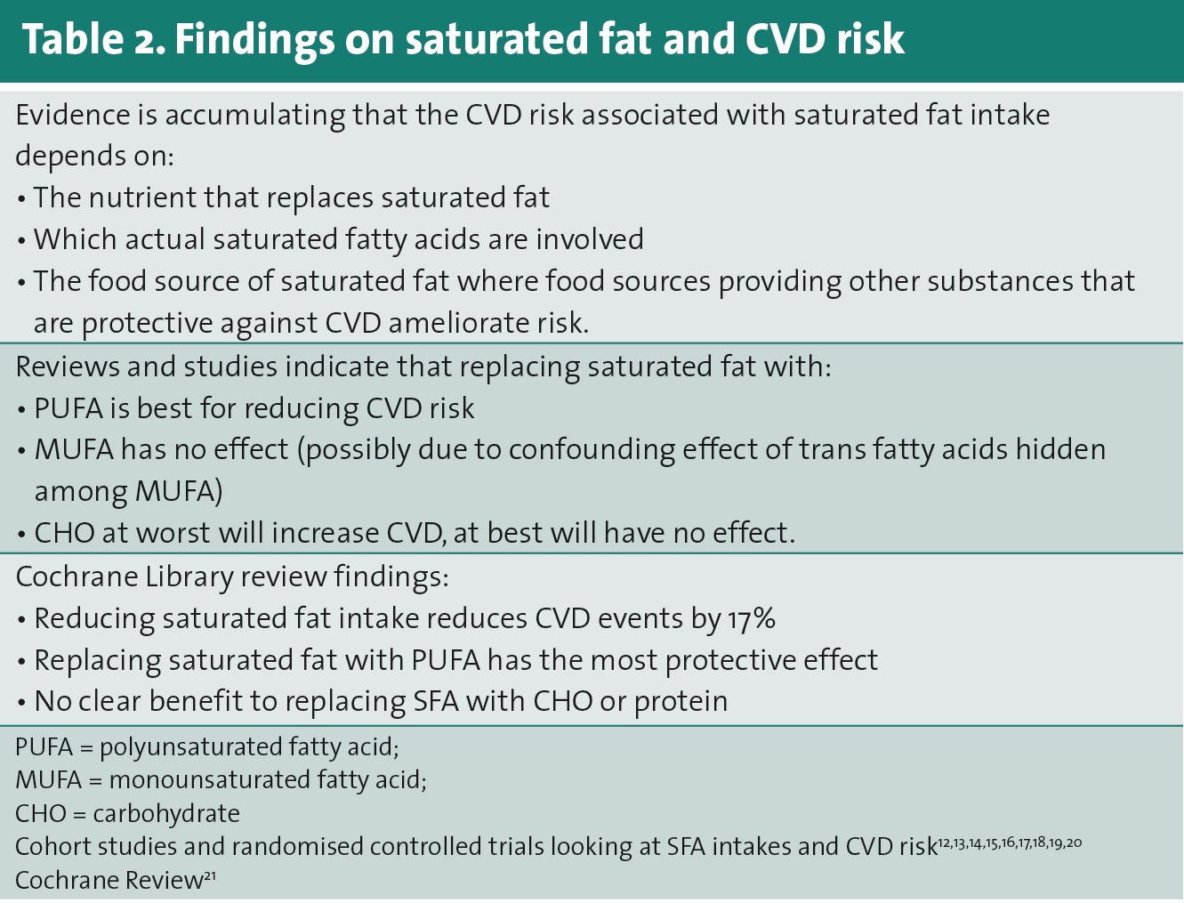 Notwithstanding variable overall levels of fat in the diet, there is global consensus that saturated fat intakes need to be kept ‘as low as possible’.2,3,4 Within this recommendation, it is recognised that some food sources of saturated fat are valuable sources of nutrients such as calcium and iron in the diet (eg. dairy and meat foods). Therefore, an upper limit of 10% of total energy intake is used for the development of food-based dietary guidelines that provide nutritionally adequate, low saturated fat diets.