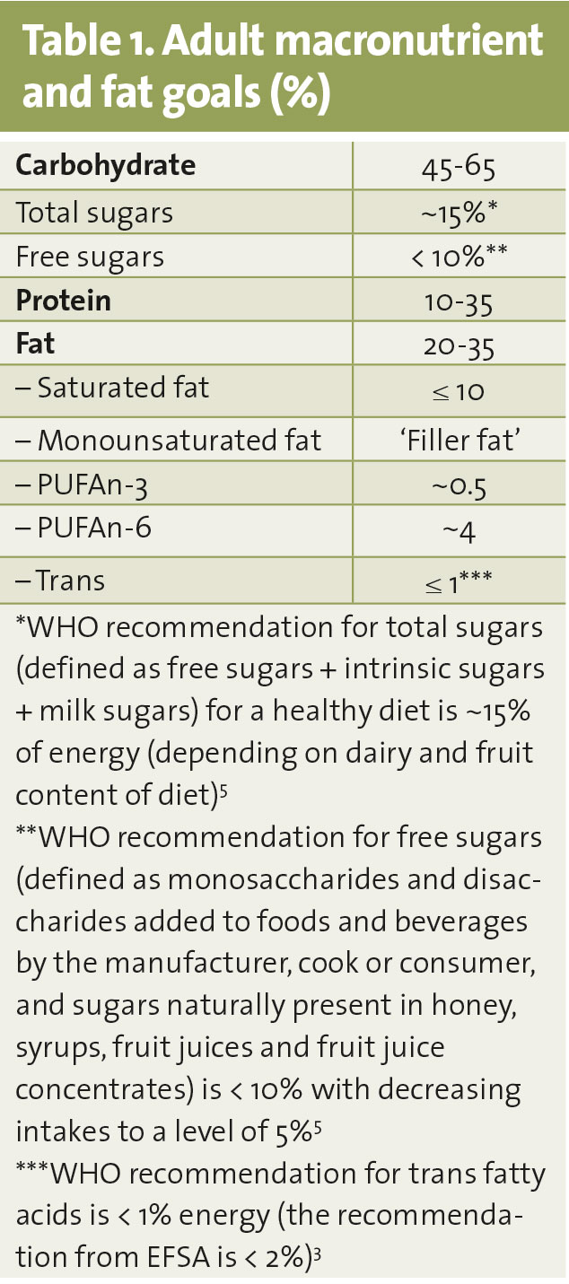 In most of the recent literature critically appraising healthy eating advice on fat and carbohydrate, there is awareness about the complexity of dietary fat, but not of dietary carbohydrate. Carbohydrate is made up of many different components and is equally, if not more, complex than dietary fat. In the simplest human health terms, some carbohydrates are beneficial (eg. components that are high in fibre and represent a complex mix of oligo-, and poly-saccharides) and some have adverse effects (refined carbohydrate low in fibre and high in sugar). The macronutrient goals for adults are outlined in Table 1 .